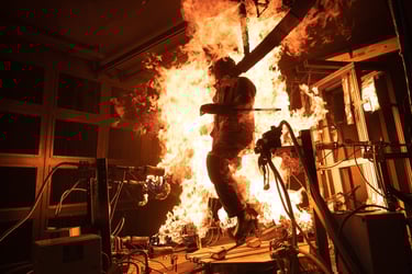 The fire test chamber is equipped with the PyroMan™ system. PyroMan™ is a fully instrumented, life-sized manikin used to evaluate the performance of thermal protective clothing. This is a highly sophisticated instrument that creates a realistic simulation of a flash fire condition and analyzes the response of manikin heat sensors to predict the potential tissue burn damage to the wearer of military, first responder, or industrial workwear.